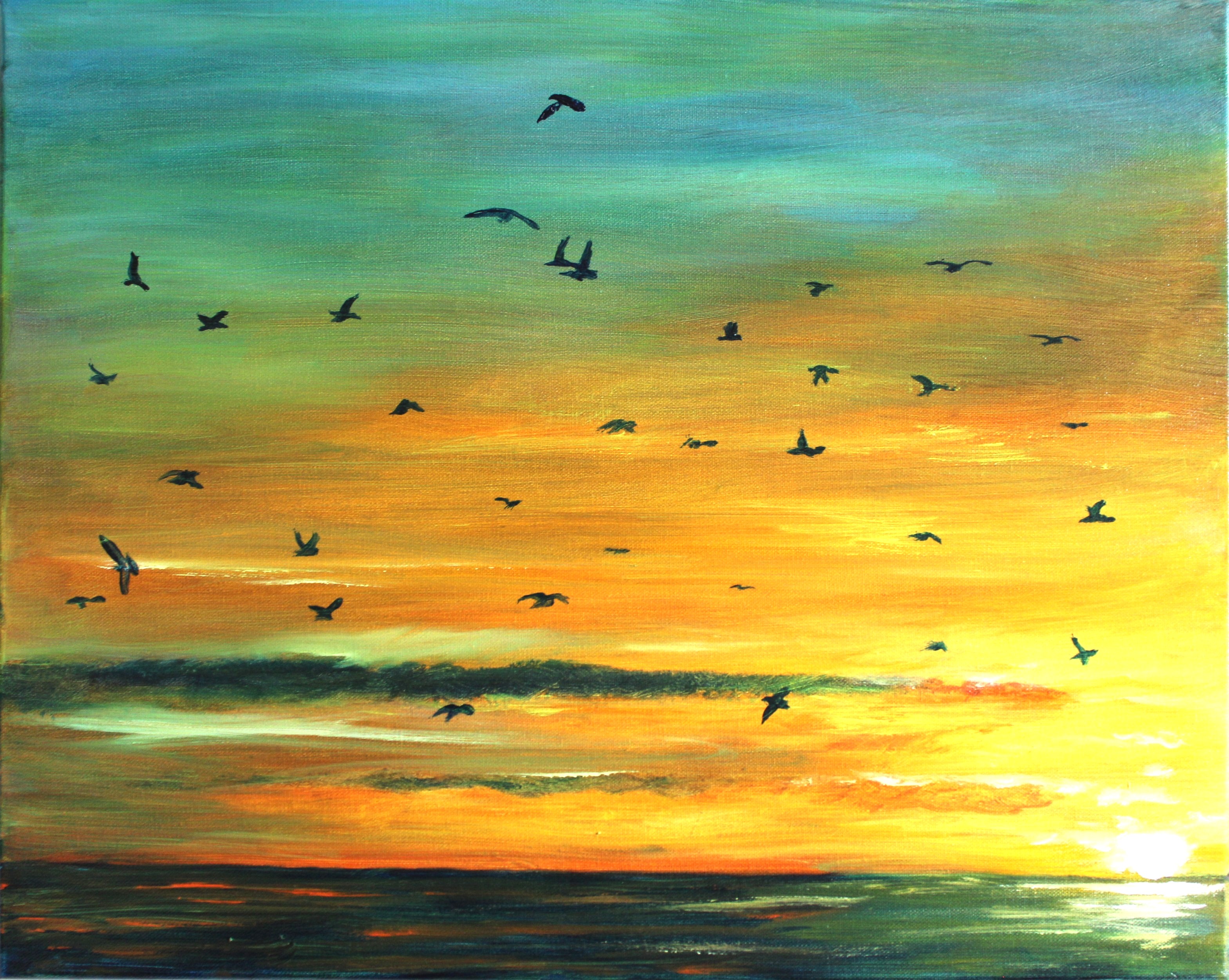 Commuters at Sunset 50 x 40 cm £225Once again the birds whirl around in the sky as the sun disappears